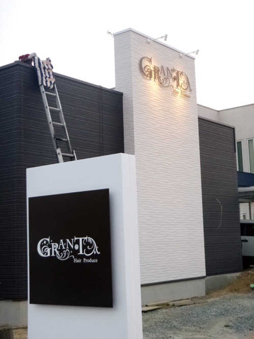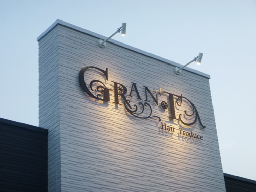 ステンレスピット文字のベースに、なるべく艶のでないよう焼き付け塗装を行い、壁面から50mm距離をあけた。 スポットライトは温かい雰囲気がでるようにLEDの電球色をチョイス。 昼間と夜の見え方が2つ楽しめるサインとなった。